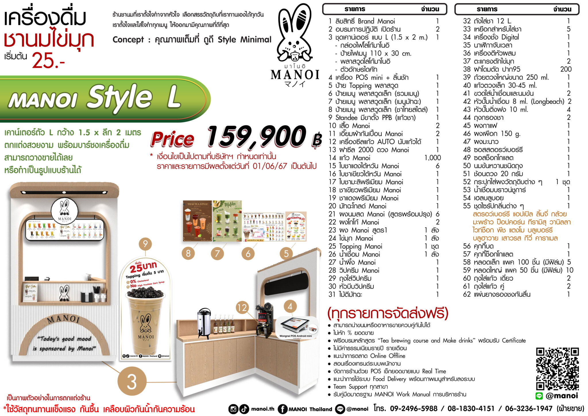 - Style L : 159,900 บาท (เป็นแพคเกจที่ได้รับเคาน์เตอร์ตัว L ตกแต่งสวยงามตามมาตรฐานแบรนด์ ขนาด 1.5×2 เมตร มาพร้อมป้ายไฟโลโก้ ป้ายไฟเมนู เครื่องซีลแก้วออโต้ ระบบบริหารจัดการร้านด้วย POS และ Lineman GP มีพื้นที่ในการชง สามารถวางขายได้เลย หรือทำเป็นรูปแบบร้านได้)